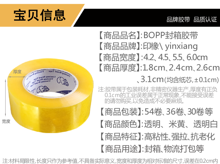【商品品名】:BOP封箱膠帶【商品品牌:印橡\ yinxiang【商品寬度】:42、45、55、60cm【商品厚度】:1.8cm、2.4cm、2.6cm3.1cm(均含紙芯,±0.1cm)注:膠帶屬于包裝耗材,非精密儀器生產厚度有正負0.1cm的工業誤差屬于正常現象,不能接受誤差的請勿購買,以免造成不必要麻煩。【商品包裝】:54卷、36卷、30卷等【商品顏色}:透明、米黃、透明白【商品特征}:高粘性、強拉、抗老化【商品用途】:封箱物流打包等